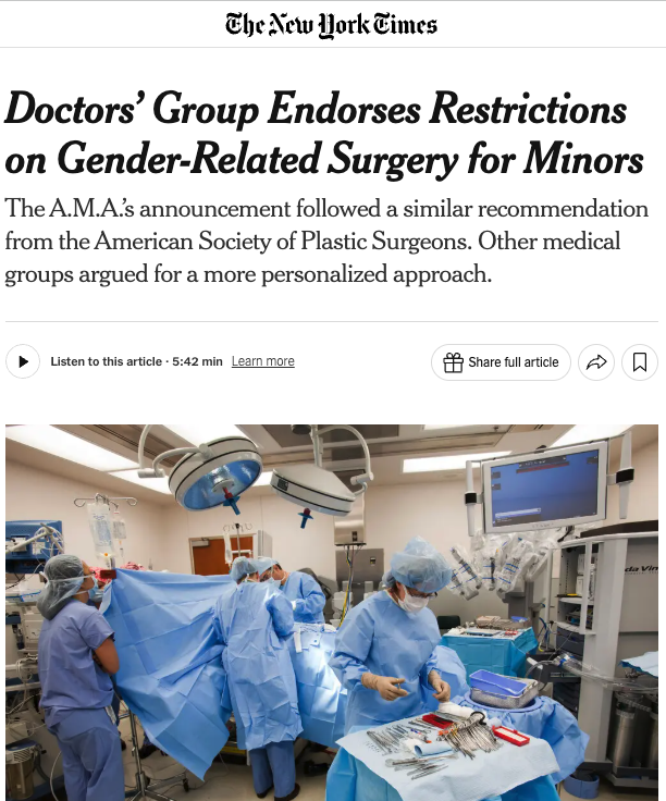 STOP PRESS: Today the New York Times is reporting the peak doctors' group, the American Medical Association, has joined the ASPS in calling for restrictions on gender-related surgical treatments for minors. This is the beginning of the end for Australia's LGBTQA+ child gender conversion therapy clinics.